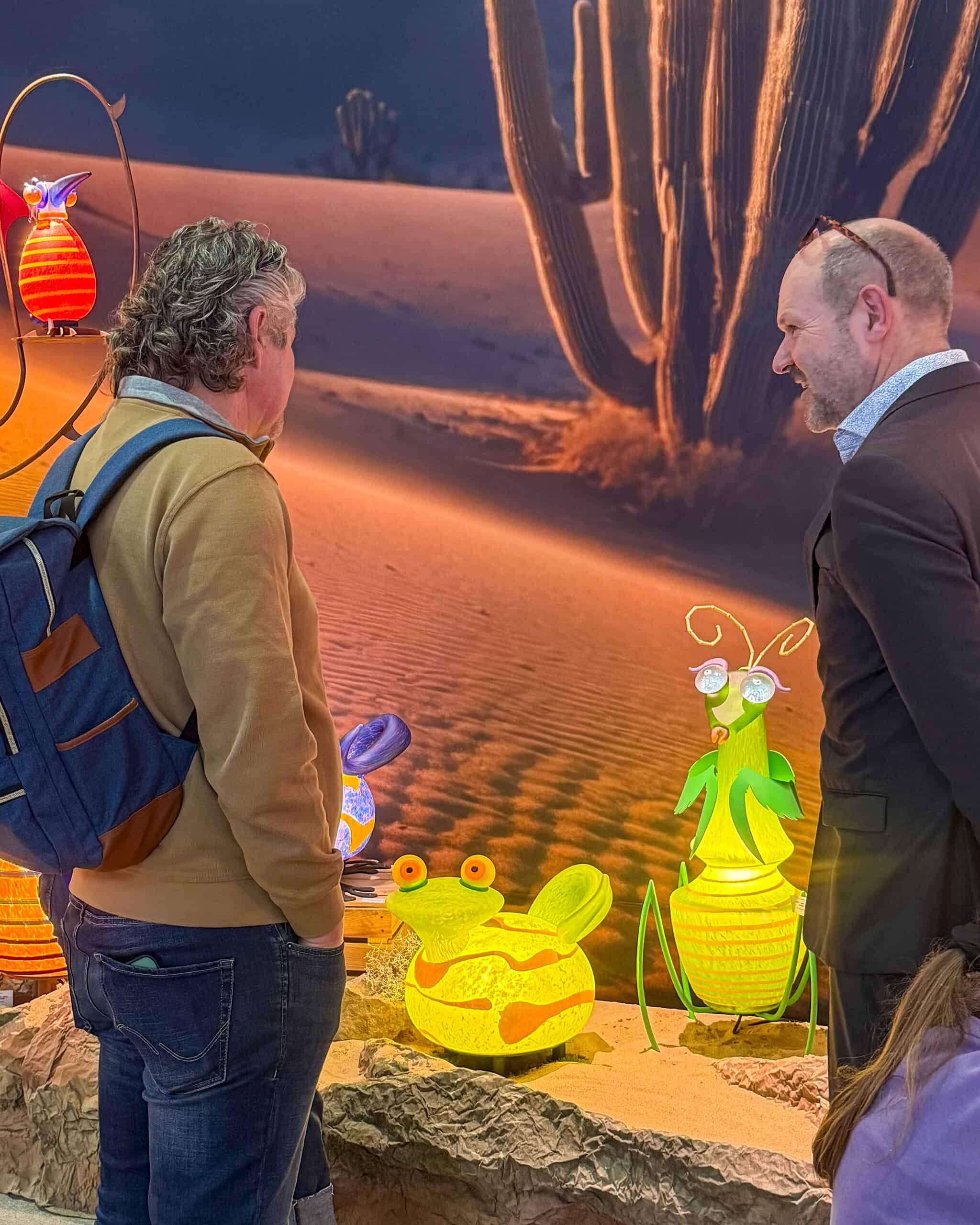 Was für eine Atmosphäre: Unser Messestand stand ganz im Zeichen der Wüste – weite Dünen, Kakteen, warmes Licht. Eine Bühne, die perfekt zu unseren Lichtobjekten passte. Zwischen Sand, Felsen und warmen Sonnenfarben konnten sich unsere leuchtenden Figuren von ihrer besten Seite zeigen.