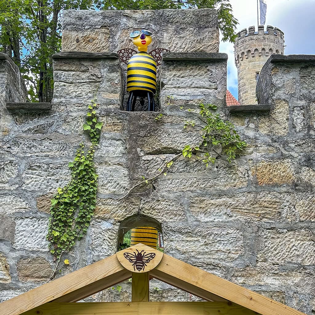 Die Borowski Outdoor Glasbiene SUZY BEE thront auf einer Burgzinne hoch über dem Bienenhaus aus Holz auf Schloss Hohenstein bei Coburg.
