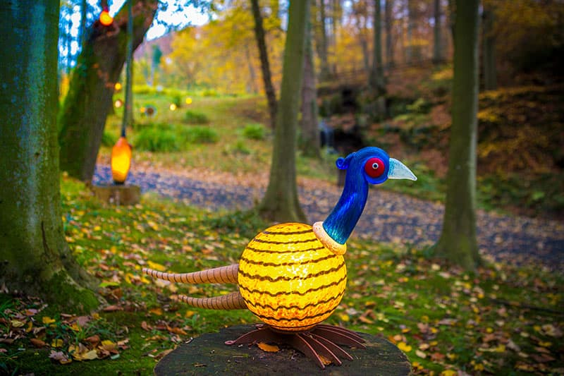 Auch unsere GONZOs dürfen in der dunkleren Jahreszeit nicht fehlen: BIG GONZO in zitro präsentiert seine zitronengelbe Strahlkraft gegen den Herbstblues, während das leuchtende Rot-Orange des Lichtvogels FAT GONZO wohltuende Wärme verbreitet. Die unbeleuchteten GONZO Skulpturen dagegen bringen mit farbenfrohem Schabernack eine charmant verspielte Seite in den Herbstwald.