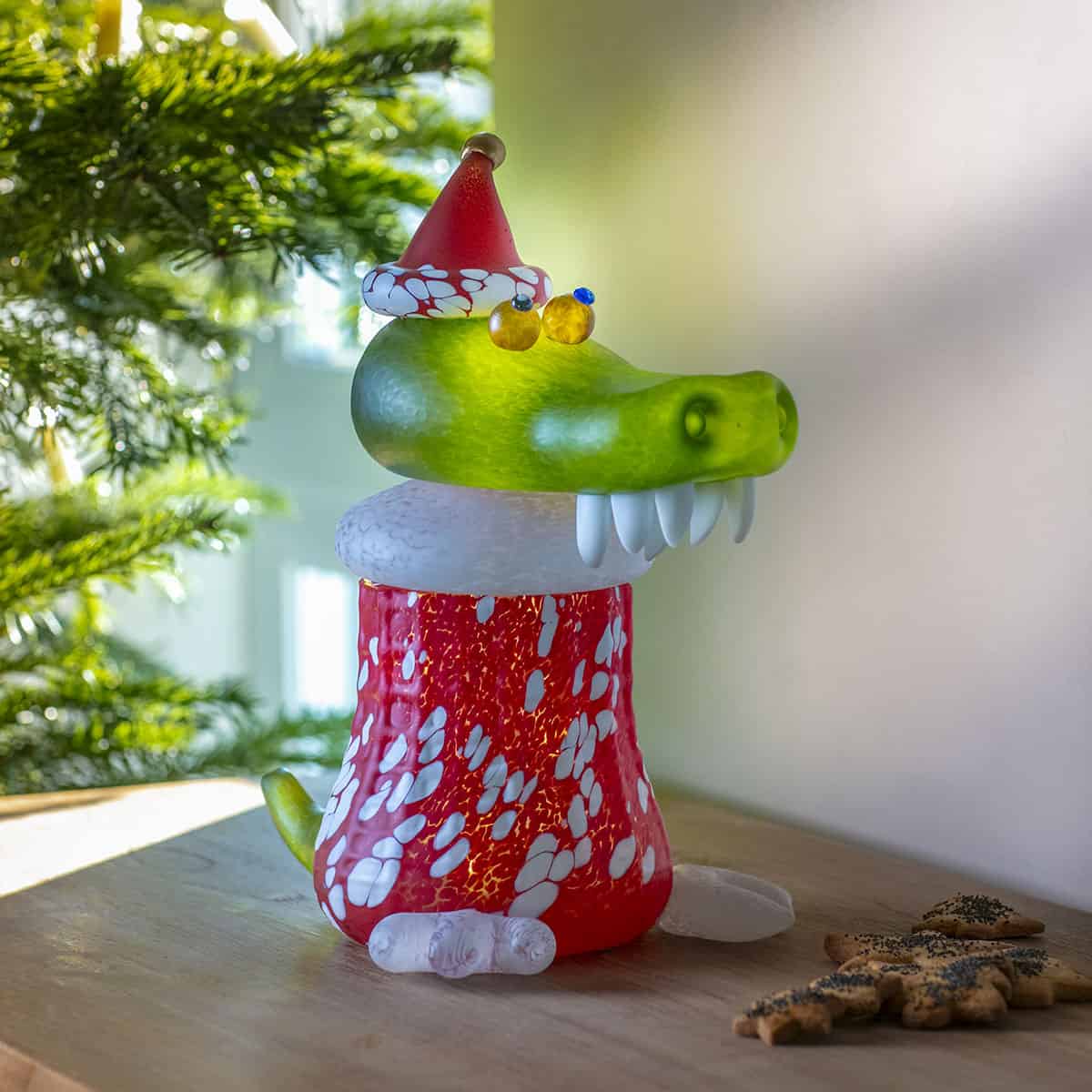 Our Christmas crocodile is an original jar that will sweeten up your holiday season, whether filled with treats or simply displayed as a glass sculpture. Those innocent-looking, round eyes will capture your heart instantly! As a candy jar, CHRIS CROC perfectly showcases gummy bears, toffees, and more. In the bathroom, it happily holds hair ties, clips, and cotton pads. You could even place a small battery-powered LED light or string of lights inside, making the crocodile glow warmly. But even with an empty belly, it shines as a standalone sculpture. You couldn’t imagine a snappier, friendlier, and more useful crocodile!