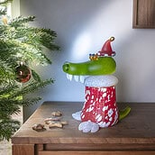 This 28 cm tall glass jar in the shape of a humorous crocodile brings instant joy at first glance: With its harmless and slightly quirky expression, cute round eyes, and red Christmas hat, this eager holiday helper is sure to make you smile. But the real surprise comes on the second look: the crocodile’s head with the festive red hat serves as a lid, making CHRIS CROC a practical container for all the little treasures you want to store during the holiday season. Thanks to its clever lid design, CHRIS CROC is highly versatile—whether as a jar for holiday sweets, small accessories, or simply as a playful decor piece that’s sure to bring a smile to your guests’ faces.