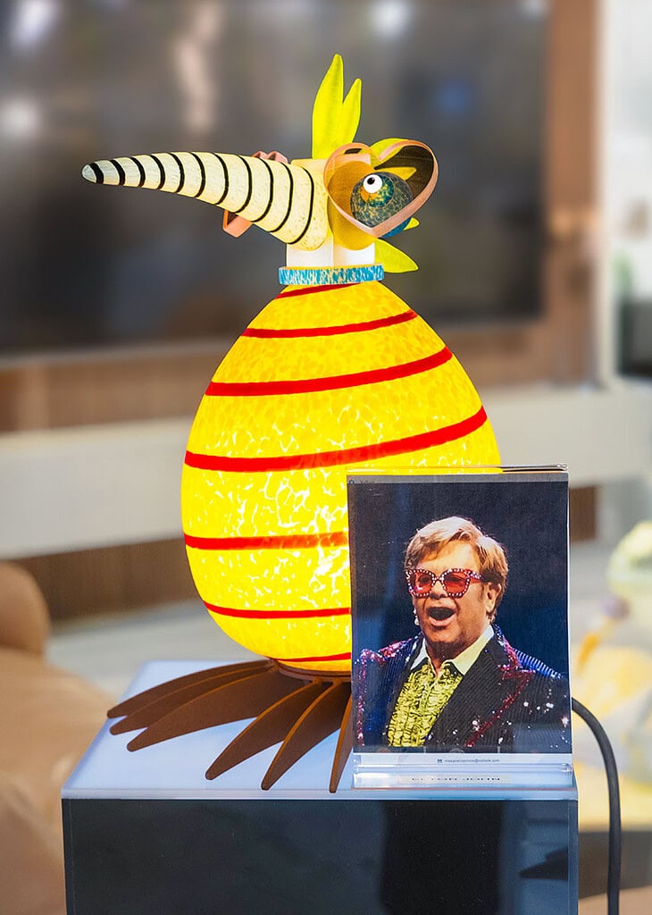 ELTON from the first ODD BIRDS brood of 2019 is a tribute to one of the most flamboyant artists in music history. With pink heart-shaped glasses and green hair, this light object captures Elton John’s unmistakable style—extravagant, playful, and full of energy.