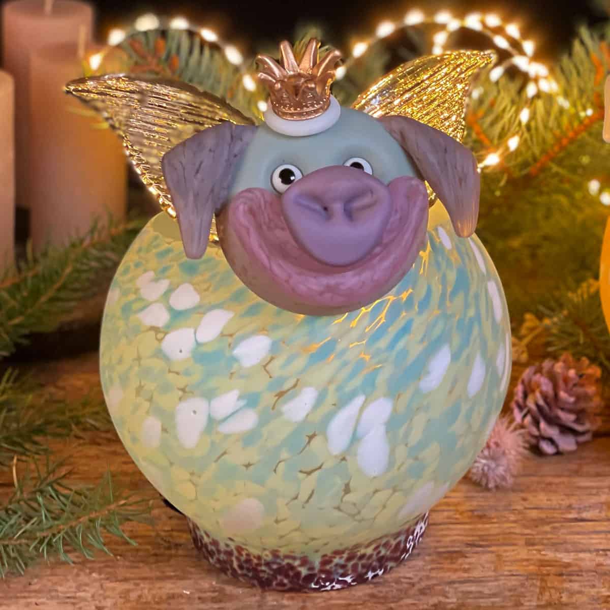 FELIX impresses with its detailed design: the round body, accented with mint-green tones, is complemented by transparent wings that sparkle enchantingly in the light of a candle or string lights. Crowned with a small crown, this piglet looks like a wondrous angel from a magical world. FELIX stands securely on a stable base, bringing a smile to every home with its friendly expression.