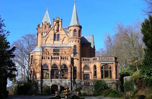 Drachenburg Castle in the Siebengebirge with a view of Königswinter and the Rhine Valley